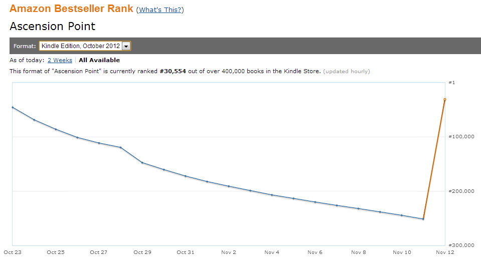 Yup–it’s stormed up to #30,554 on the back of that single sale. You have to assume that it takes a few more sales than that to be ranked in the top, I don’t know, ten thousand. But it’s still nice to see the line going upwards 🙂
