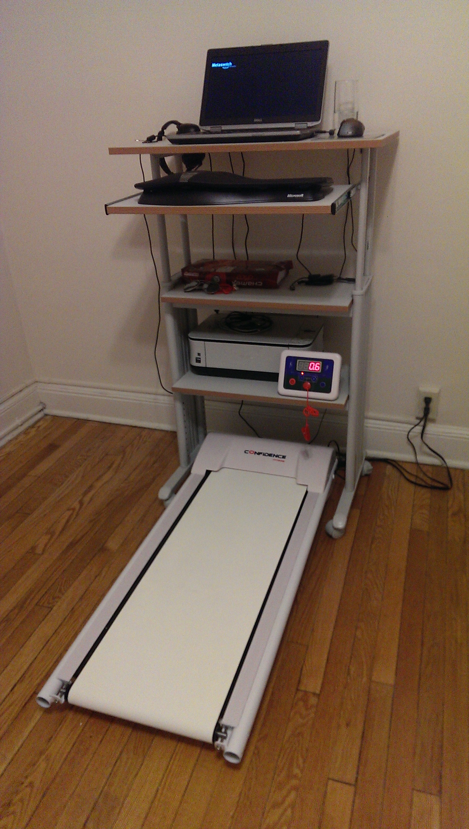After about eighteen months of using a standing desk to work from home, and loving it, last week I took the final step in banishing the sedentary aspect of working on a computer all day. I’ve been following the trends in treadmill desking over the last year or so, and particularly the amazingly in-depth Treadmill Desk Diary. It was based on the recommendations there that I bought my desk and my treadmill. And the colours even match, which is a nice bonus!